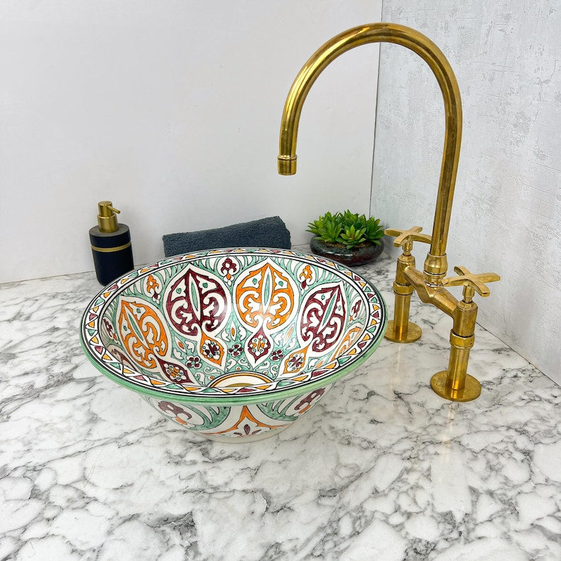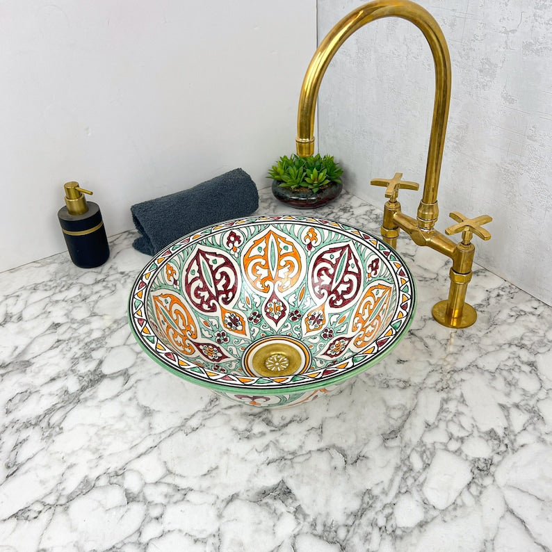 Incorporating this Moroccan ceramic sink into your bathroom is a surefire way to personalize your space, creating an authentic ambiance. Redefine your bathroom with our hand-painted Moroccan ceramic sink, bringing a touch of oriental refinement.